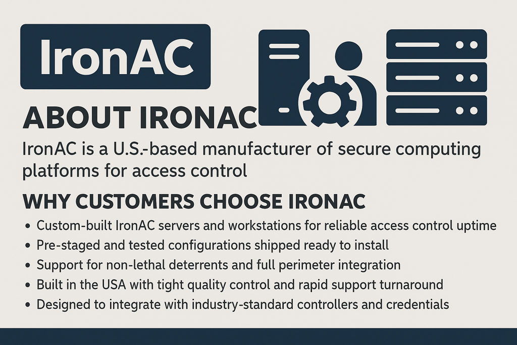 About IronAC About IronACIronAC is a U.S.-based manufacturer of secure computing platforms for access control. We build the hardware backbone—servers, workstations, and integration interfaces—that power professional access control systems across government, enterprise, education, and infrastructure markets. We Build the FoundationOur role is simple and essential: we manufacture the systems that drive the controllers, manage the credentials, and log every event. We don’t just move boxes—we engineer complete, pre-configured access platforms that work out of the box. Why Customers Choose IronAC