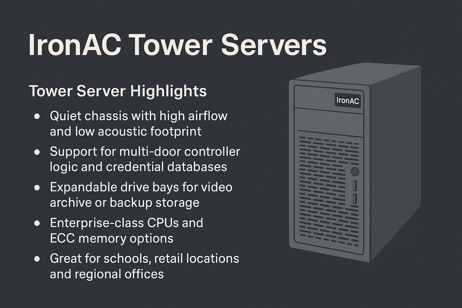 Page heading IronAC Tower ServersIronAC Tower Servers are ideal for access control environments that require high performance, quiet operation, and easy maintenance in non-rack locations. Designed for security offices, guard stations, and remote buildings, these systems offer the power of a full-scale server in a compact, standalone format. Optimized for Standalone DeploymentTower Servers provide the flexibility to support complex access control logic, software platforms, and live monitoring—all without a data center or rack. They’re perfect for deployments where space, airflow, or access to traditional IT infrastructure is limited. Tower Server Highlights