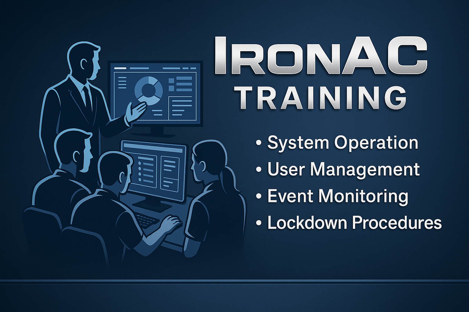 IronAC Training IronAC TrainingIronAC offers structured training programs to help your team operate, manage, and maintain your access control system with confidence. From operator basics to advanced administrative control, we deliver training that fits your environment, schedule, and staff expertise. Customized for Your TeamWhether you need remote sessions, on-site instruction, or video-based walkthroughs, IronAC provides training that aligns with your actual deployment. Our curriculum includes hands-on use of your configured system—not just generic demos. Training Topics Include: